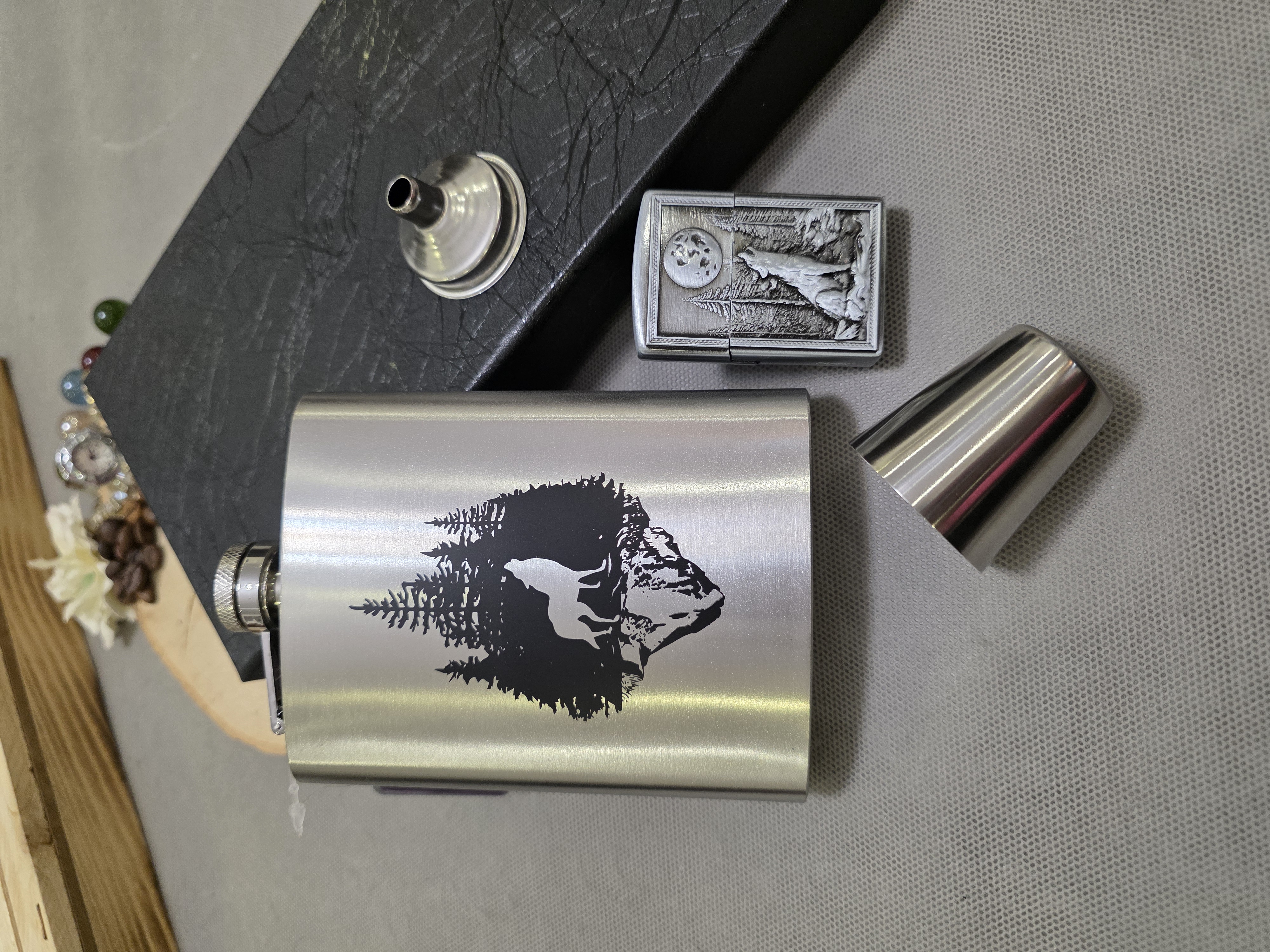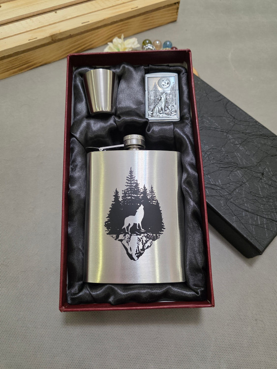 Steel pocket bottle with wolf design
