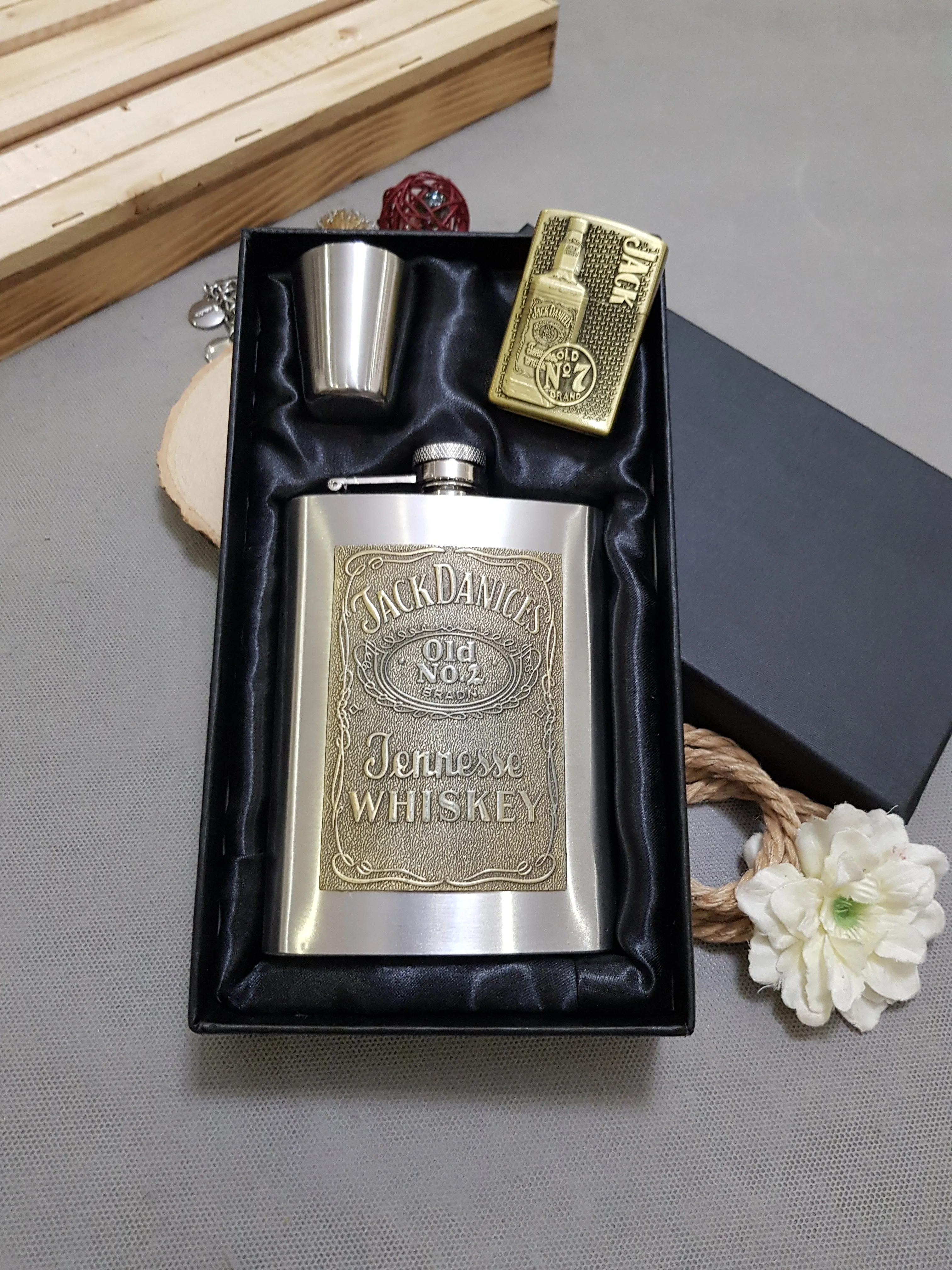 ست بطری جیبی استیل پلاک دار جک دنیلز با فندک گازی