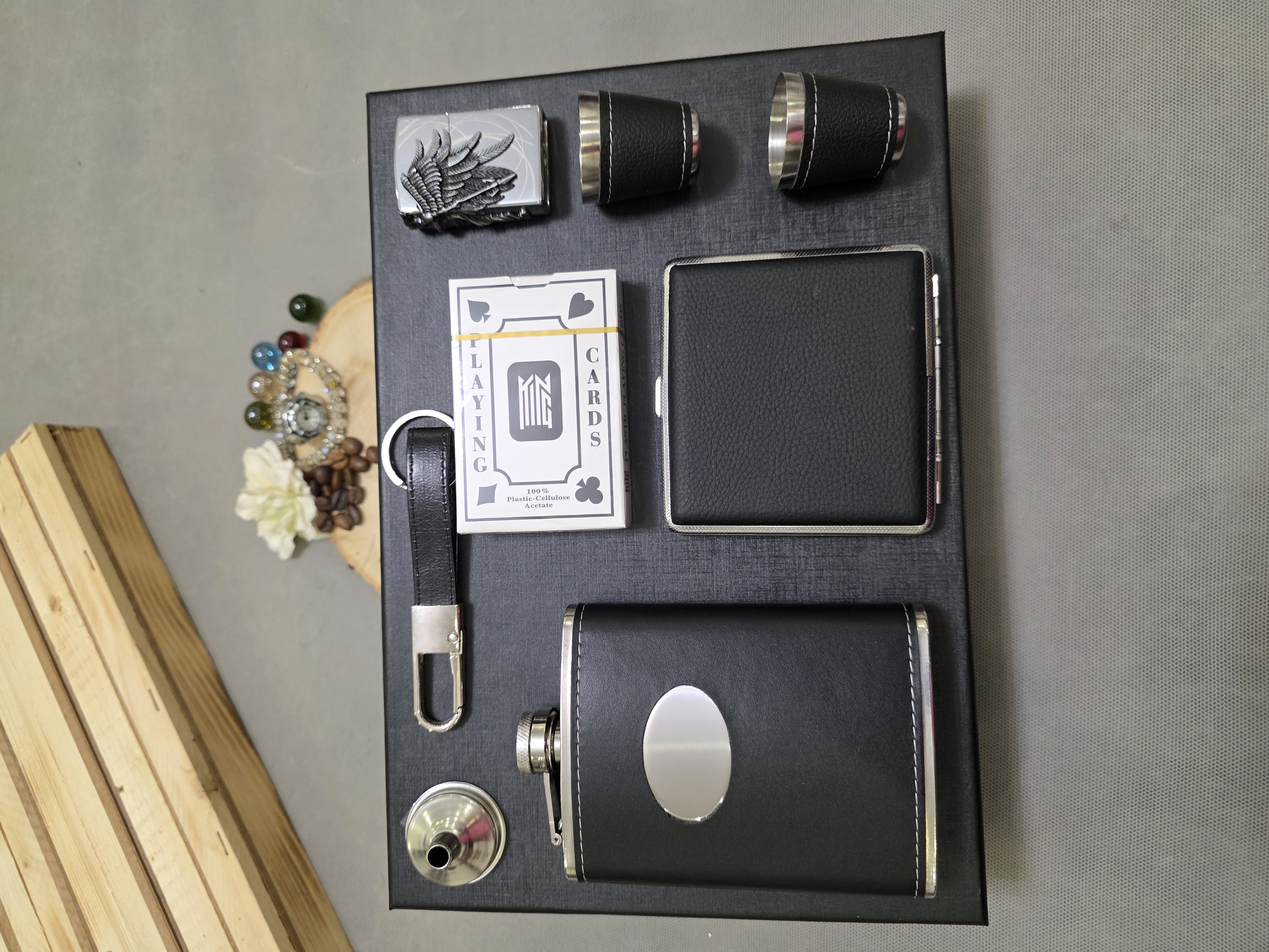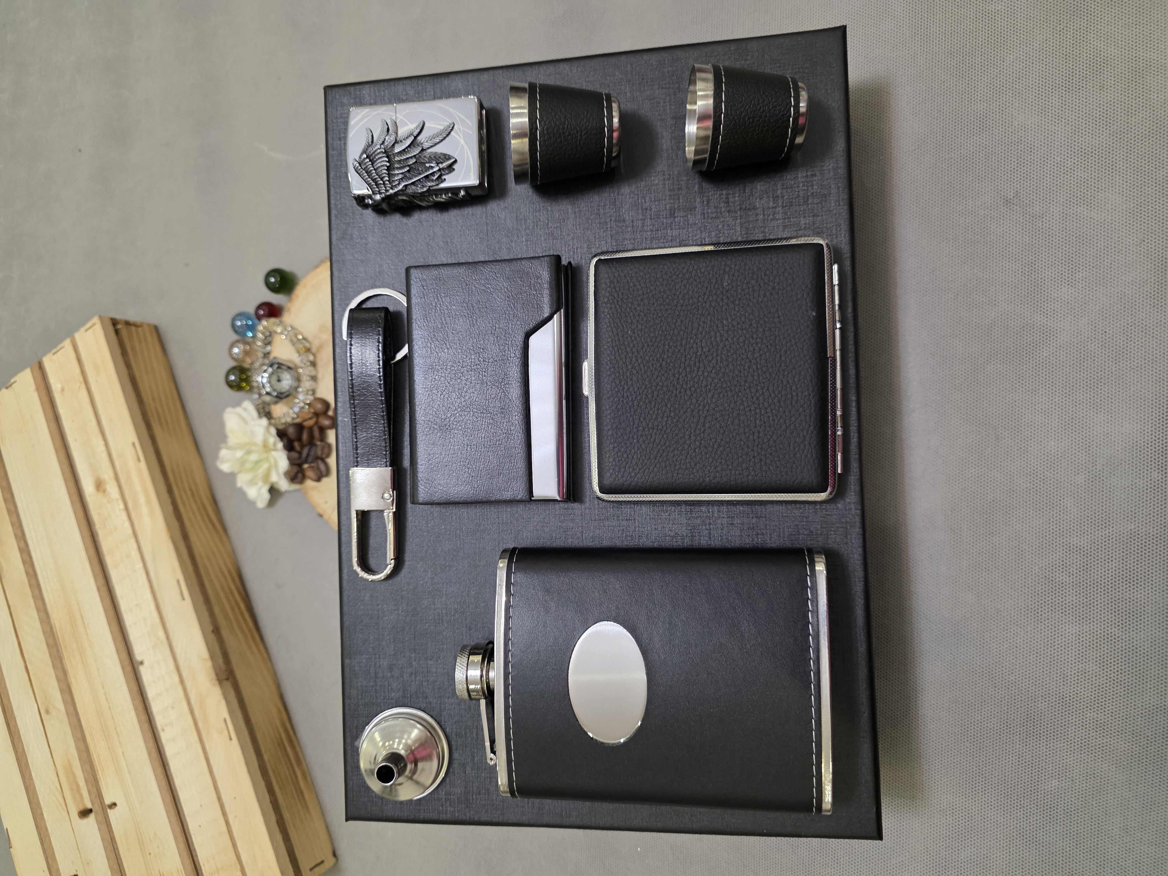 ست وی آی پی شامل یک عدد بطری جیبی استیل با روکش چرم مشکی به همراه پیپ و شات و فندک حجم بطری 240 سی سی فندک گازی مدل آمازون با شعله مغمولی