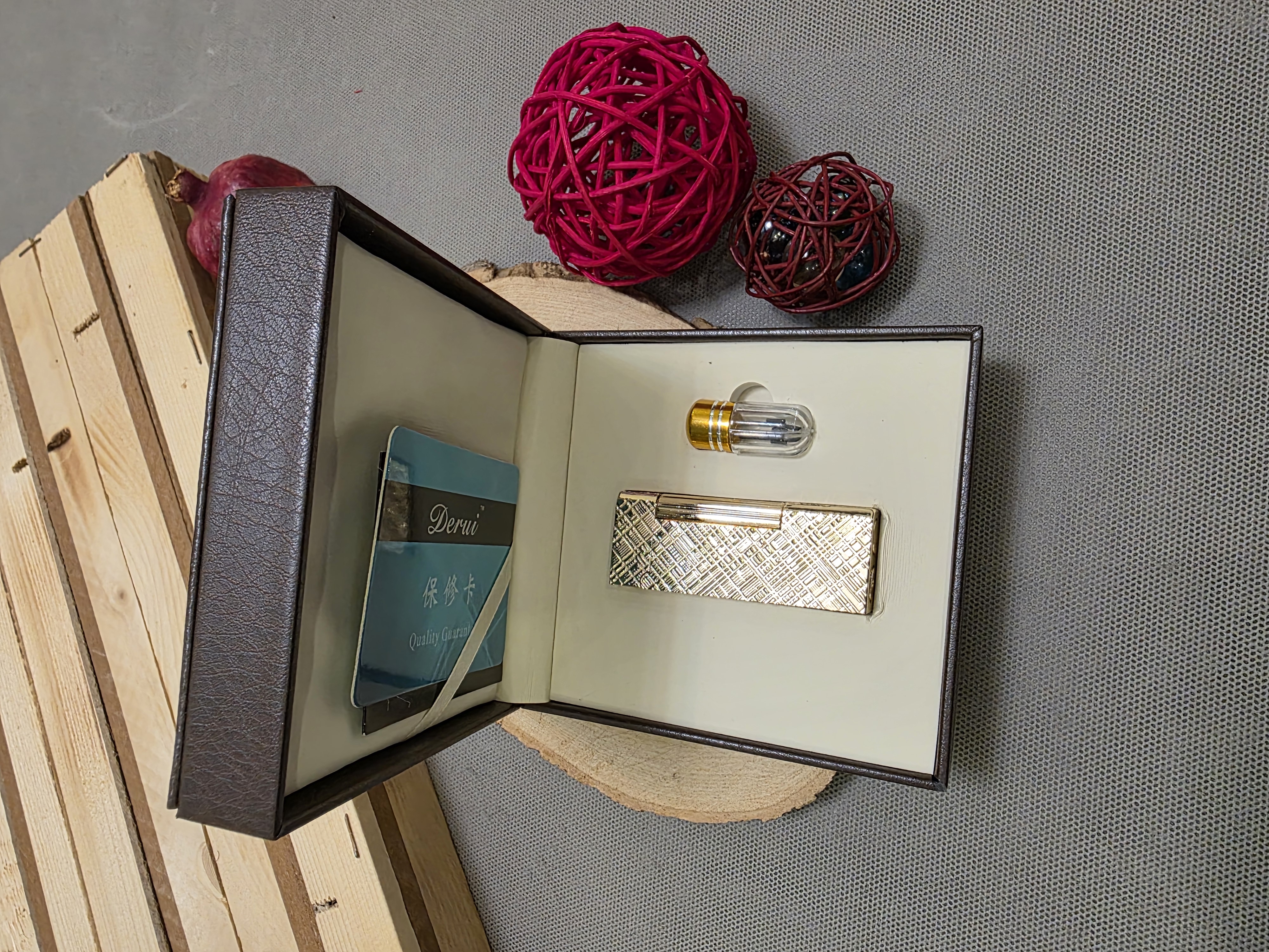 فندک گازی بغلزن طلایی برند دروی به همراه جعبه ی کادویی چرم و سنگ زاپاس