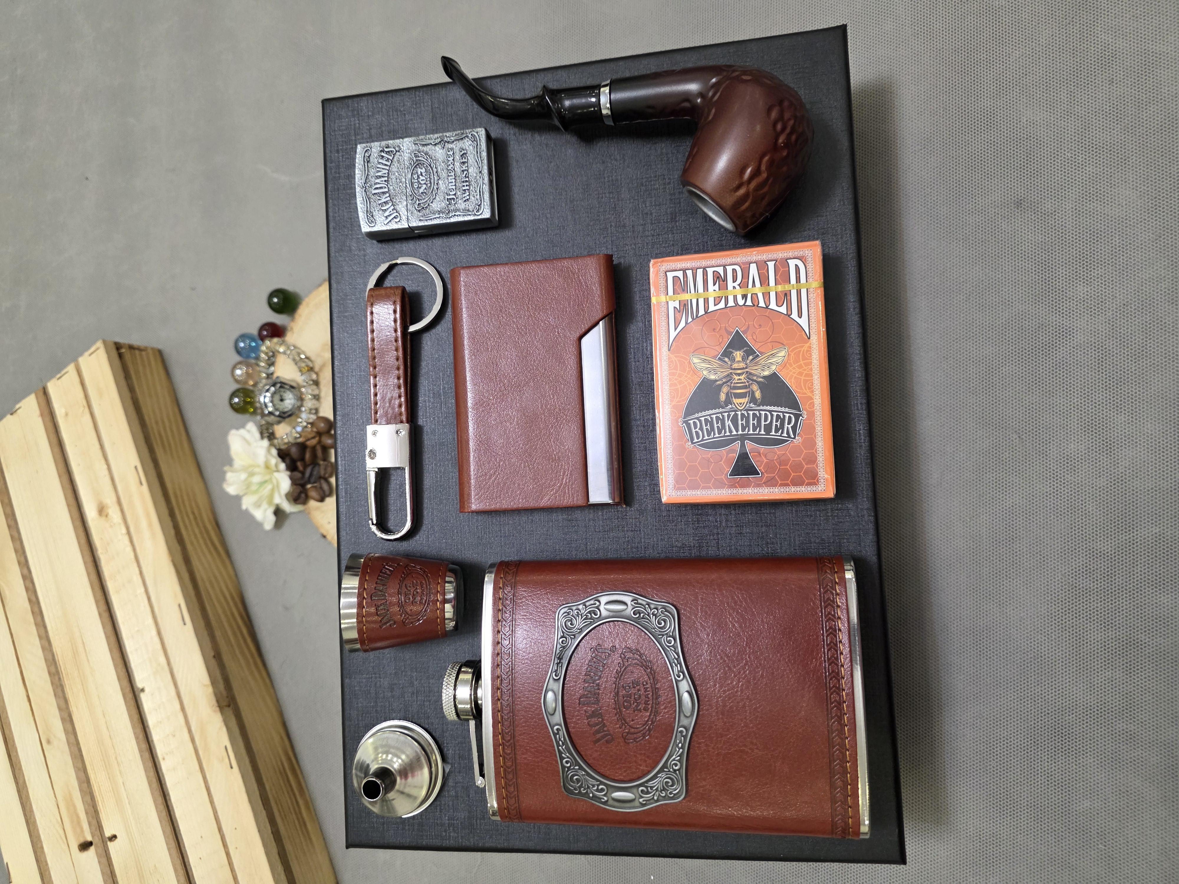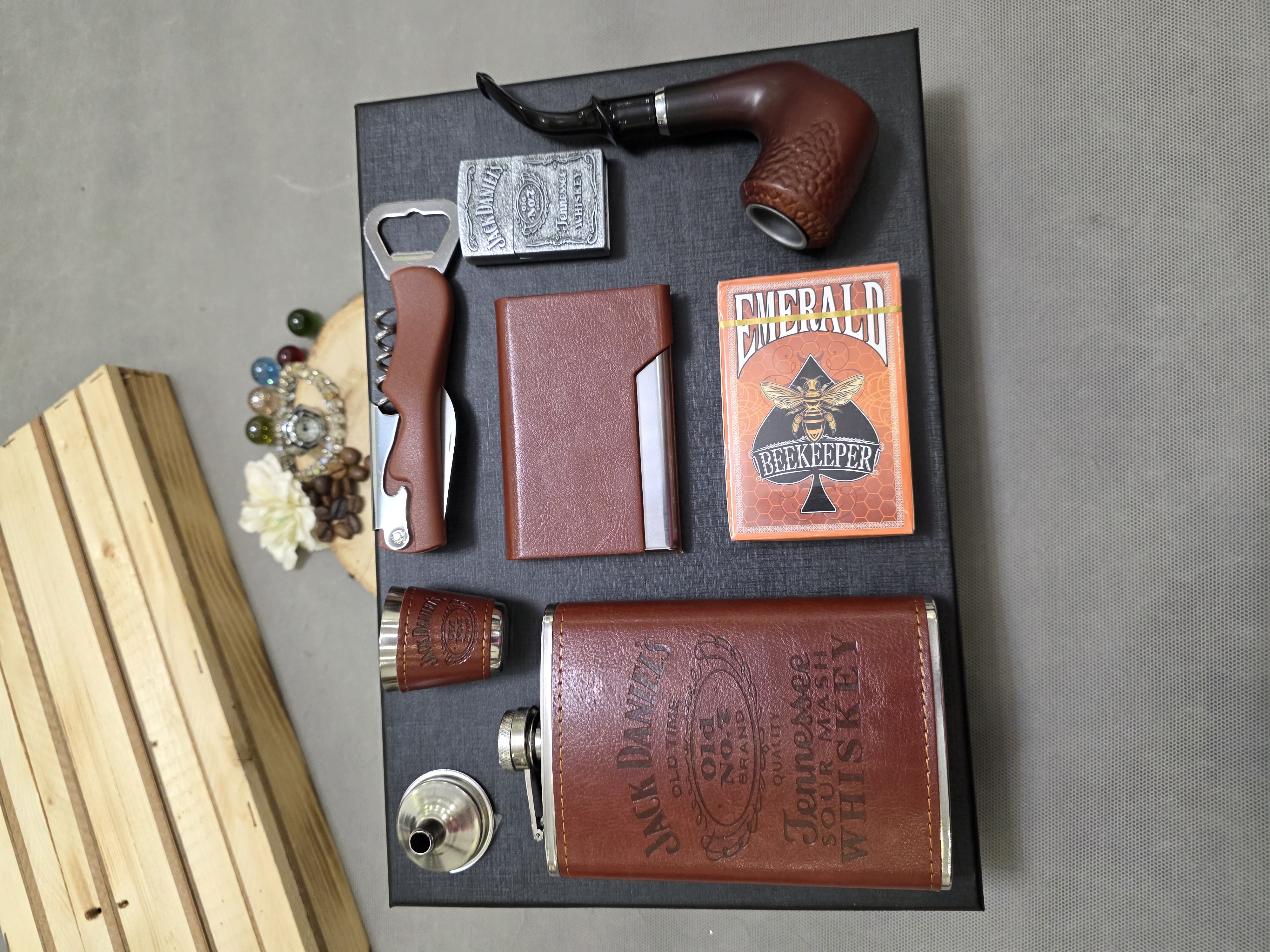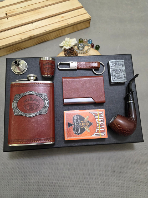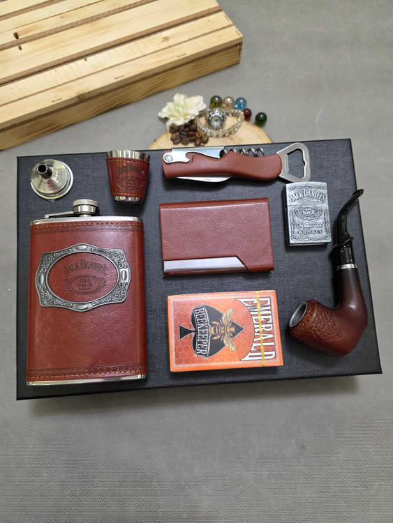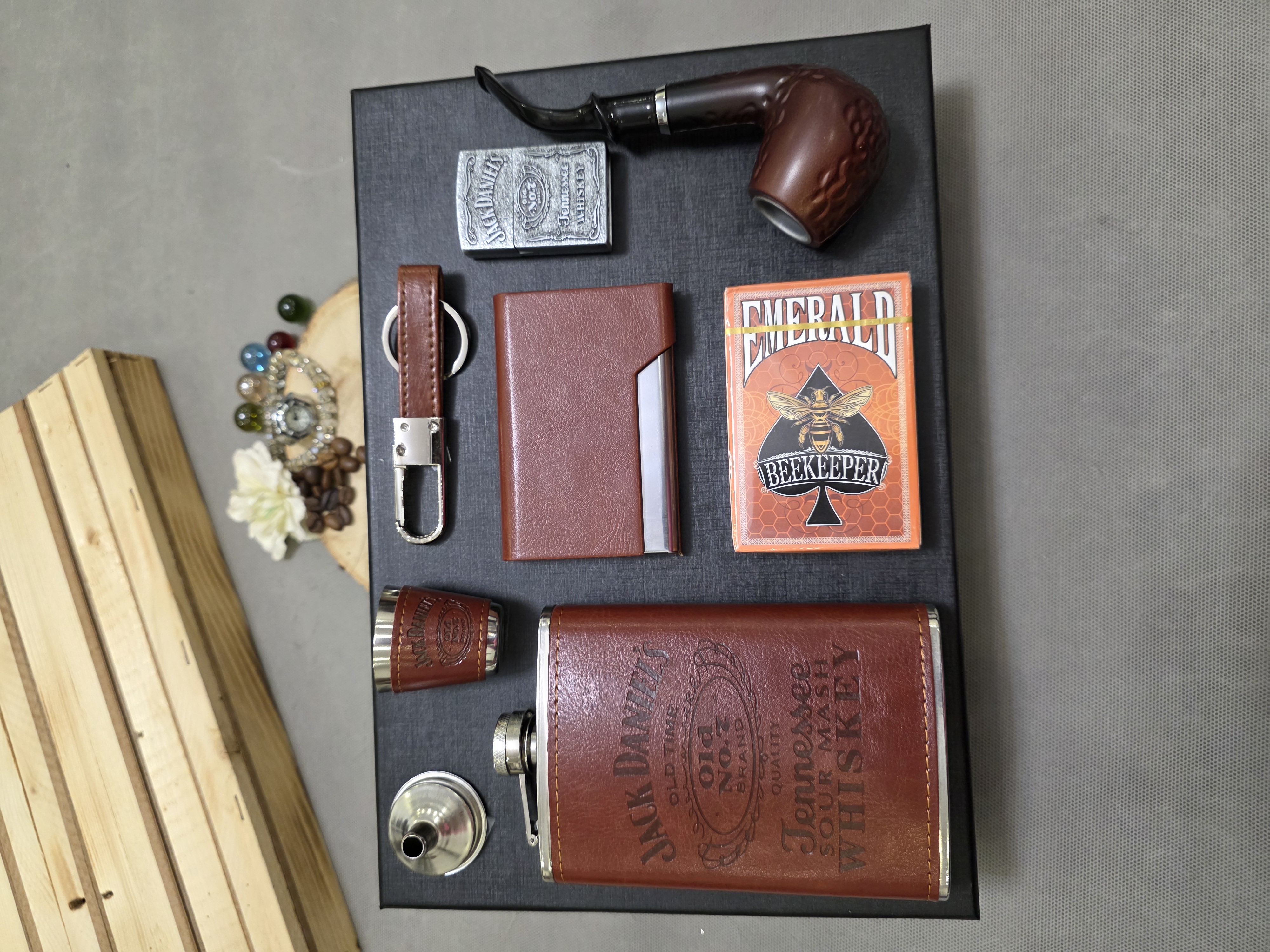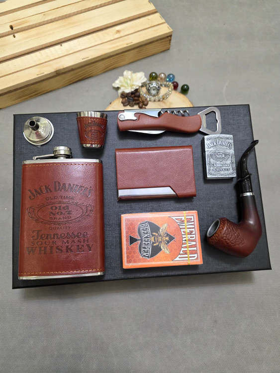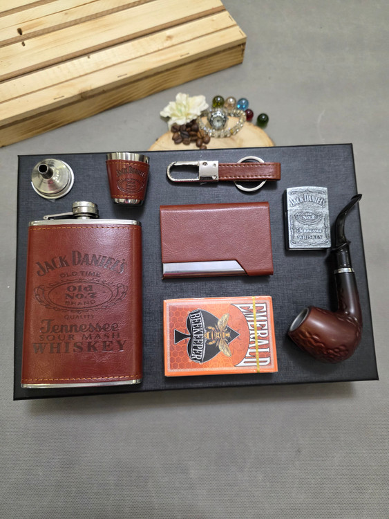 یکی از این ست های وی ای پی که توی صفحه اصلیه شامل بطری جیبی با پلاک طلایی جکدنیلز و به همراه یک عدد شات و جاسیگاری و جاکارتی و جاسوییچی چرم مشکی و به همراه فندک گازی طلایی جکدنیلز و یک عدد قیف