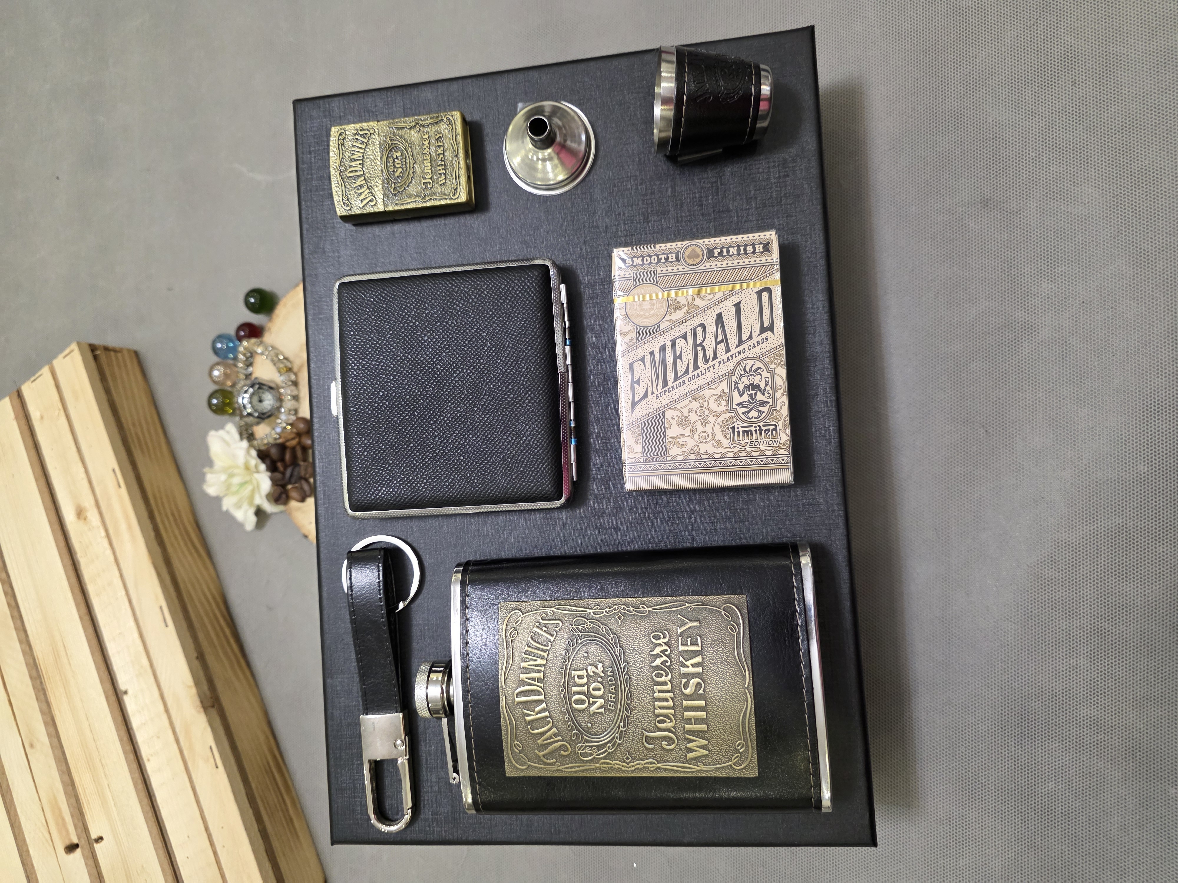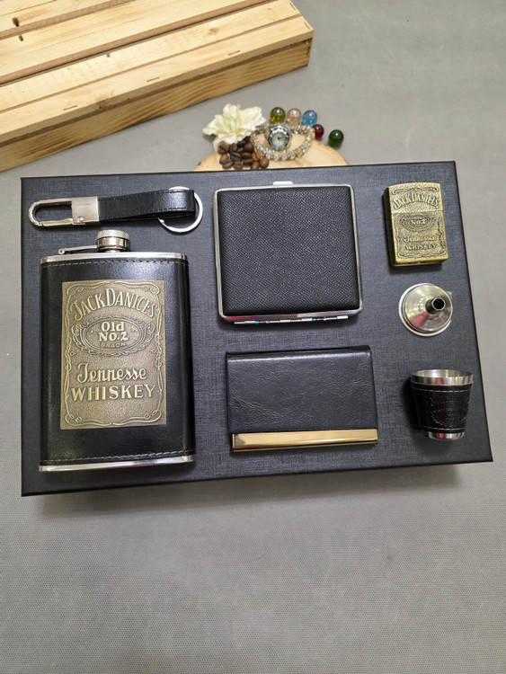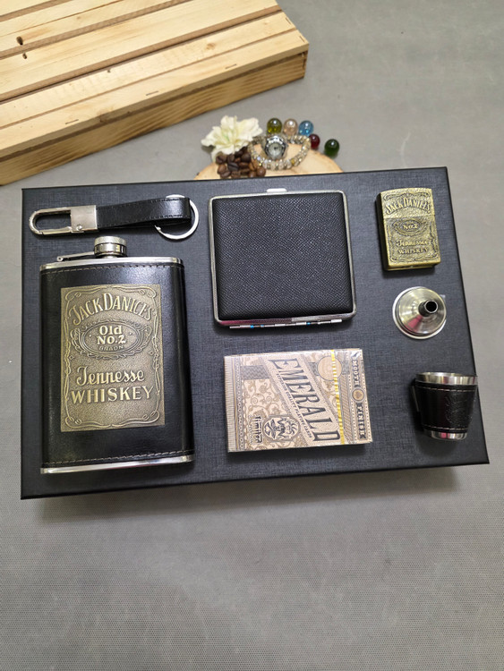 یکی از این ست های وی ای پی که توی صفحه اصلیه شامل بطری جیبی با پلاک طلایی جکدنیلز و به همراه یک عدد شات و جاسیگاری و جاکارتی و جاسوییچی چرم مشکی و به همراه فندک گازی طلایی جکدنیلز و یک عدد قیف