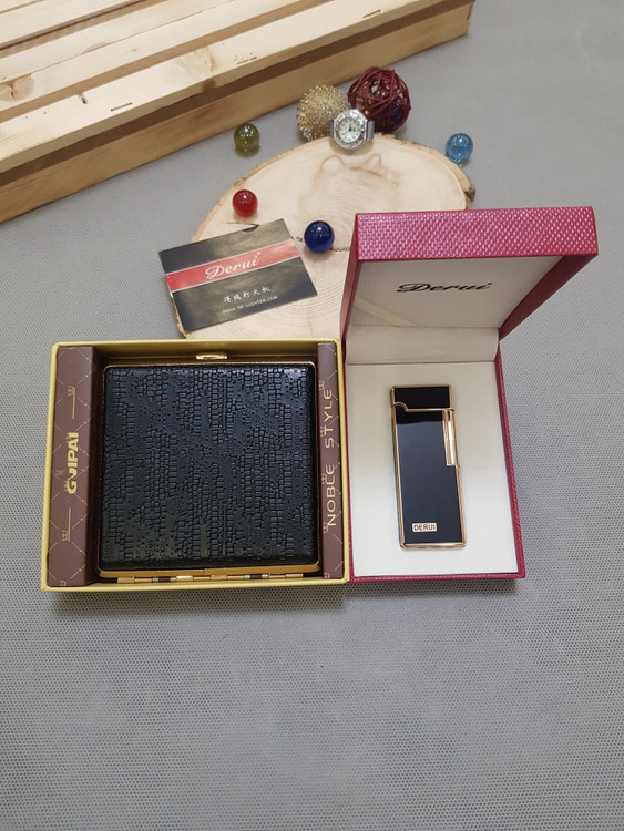 این ست هدیهی بینظیر، ترکیبی هنرمندانه از اصالت و کیفیت است. جاسیگاری چرم برند گوپای (Gopay) با رنگ مشکی و جزئیات طلایی، در کنار فندک گازی بغلزن کتابی برند دروی (Derui) با طرح لاکی مشکی-طلایی، مجموعهای کامل و شیک را برای هدیه دادن یا استفاده شخصی ایجاد کردهاند.