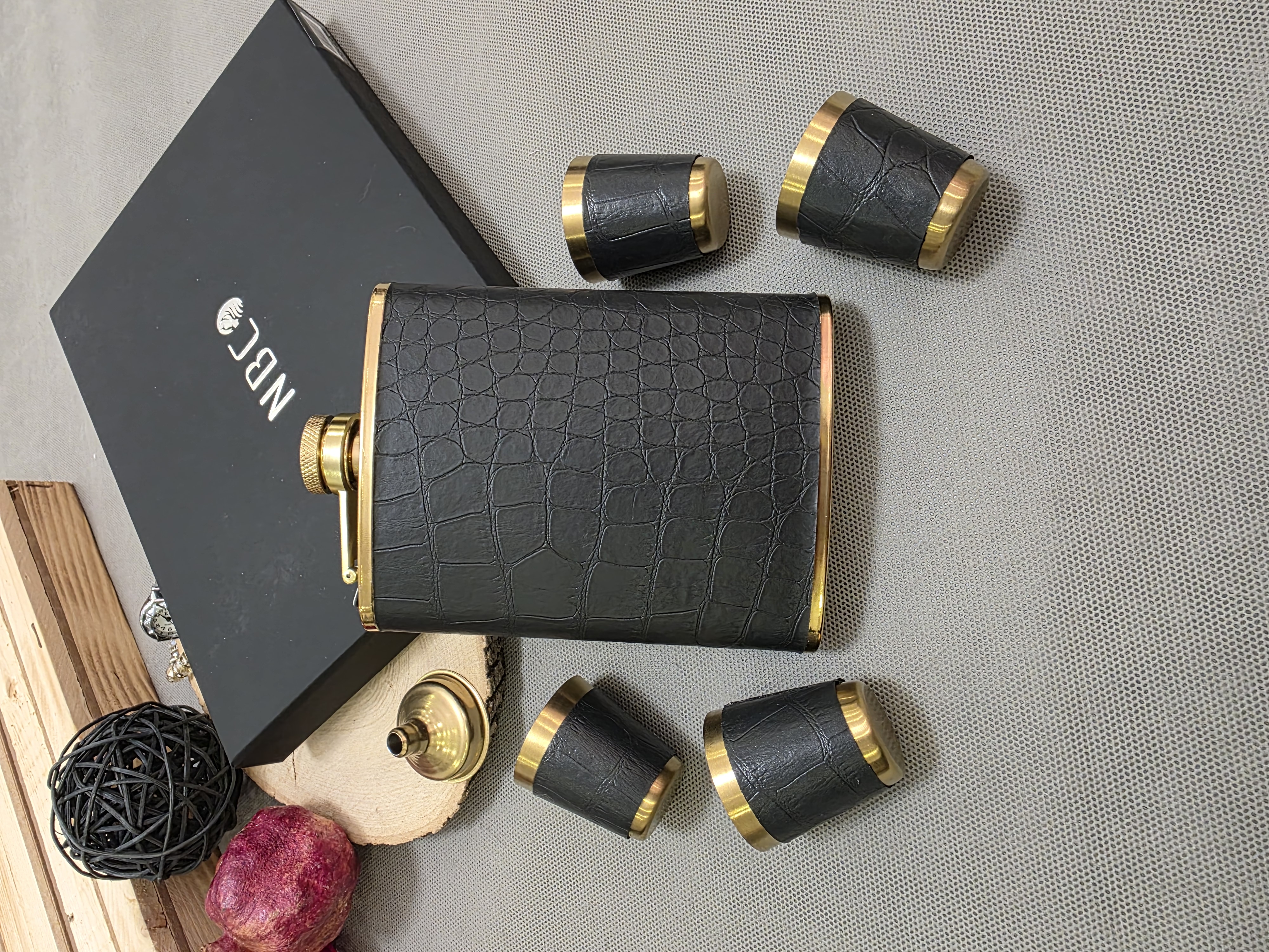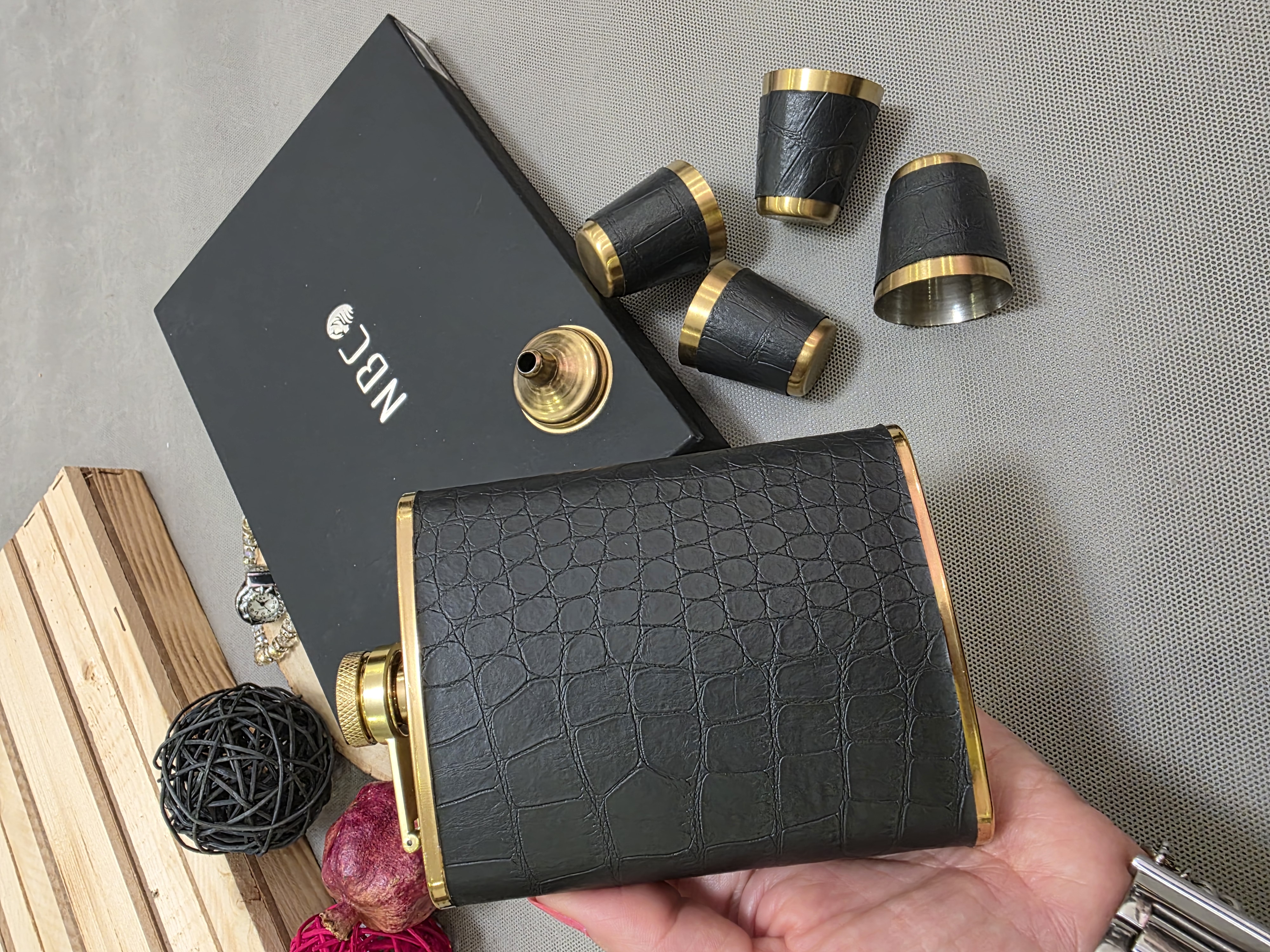 ست فندکدار چرم پلاکدار یه ست شیک و متفاوت با کیفیت عالی که شامل یه بطری جیبی چرم پلاکدار با ظرفیت ۲۴۰ سیسی و ، یه فندک بنزینی طرح زیپوی جذاب ، دو عدد شات چرم و یه قیف میباشد رنگ جذاب مشکی طلایی این ست و خیلی متمایز کرده